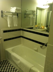 The room was very nice with a large soft bed and feather pillows.  A desk, a soft chair and a love seat filled the room but didn’t make it feel crowded at all.  The bathroom had both a shower and a separate soaking tub and a large vanity with enough space that you didn’t need a second, but if you did there was an extra vanity outside the bathroom next to the closet.   I can’t remark enough about how much I like the bathroom.  I would love to redo the one in our condo just like it, but alas I don’t think we have enough space to make it work (and I’ve been told that getting rid of the walk-in closet is out of the question).