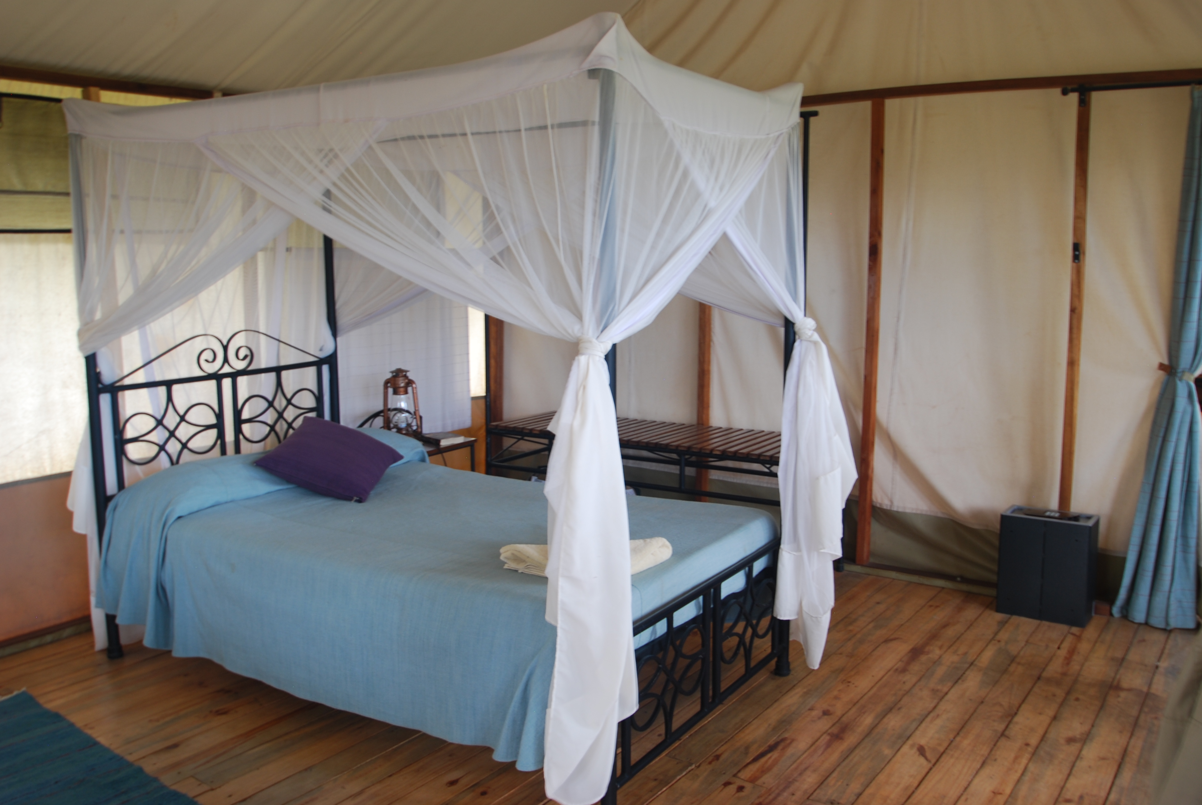 Our mosquito-net-surrounded bed inside our Maramboi tent.