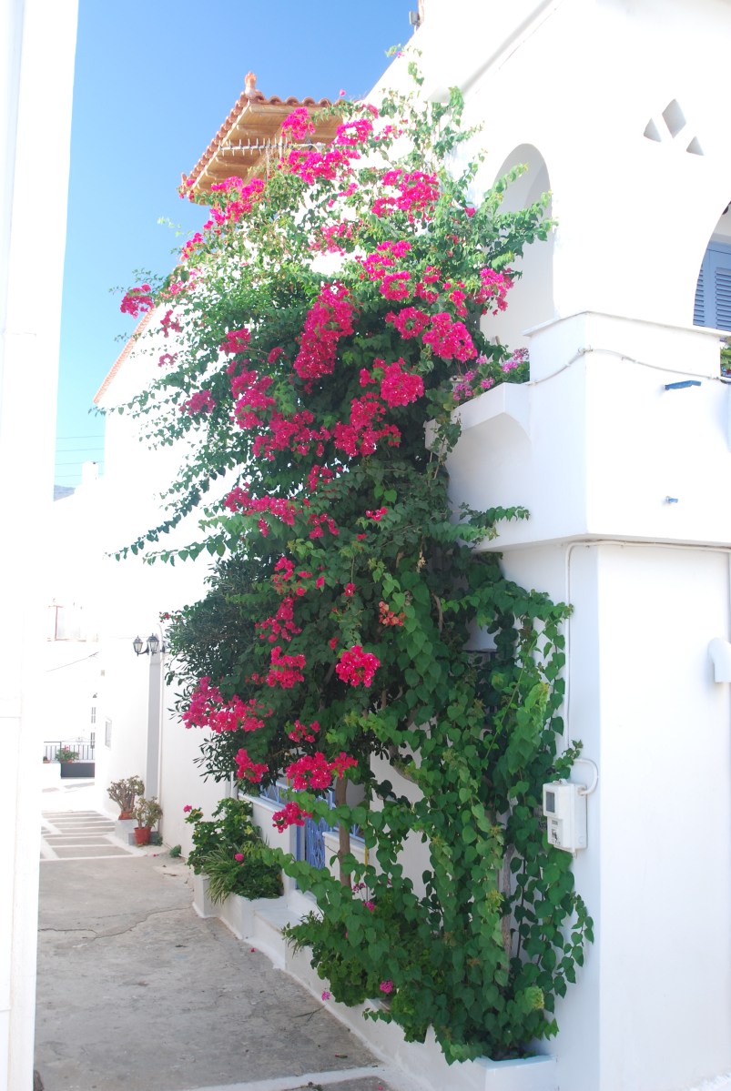 Bougainvillea cascade down a whitewashed wall in Batsi, Greece.