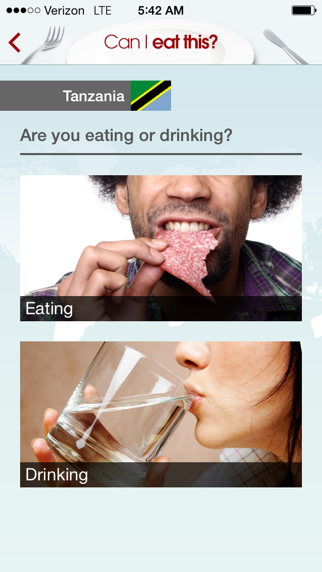 If you select yes, the app tells you the beverage is not safe to drink since the ice is probably made from tap water and the tap water might not be safe (at least for you and your digestive system; it’s perfectly safe for locals who are routinely exposed to anything floating around in that tap water). Let’s say you’re not considering an iced drink. The app gives you a list of different kinds of beverages like milk, juice, soda, water, alcohol, or coffee. You simply click on your choice and answer any follow-up questions to get the CDC’s recommendation.