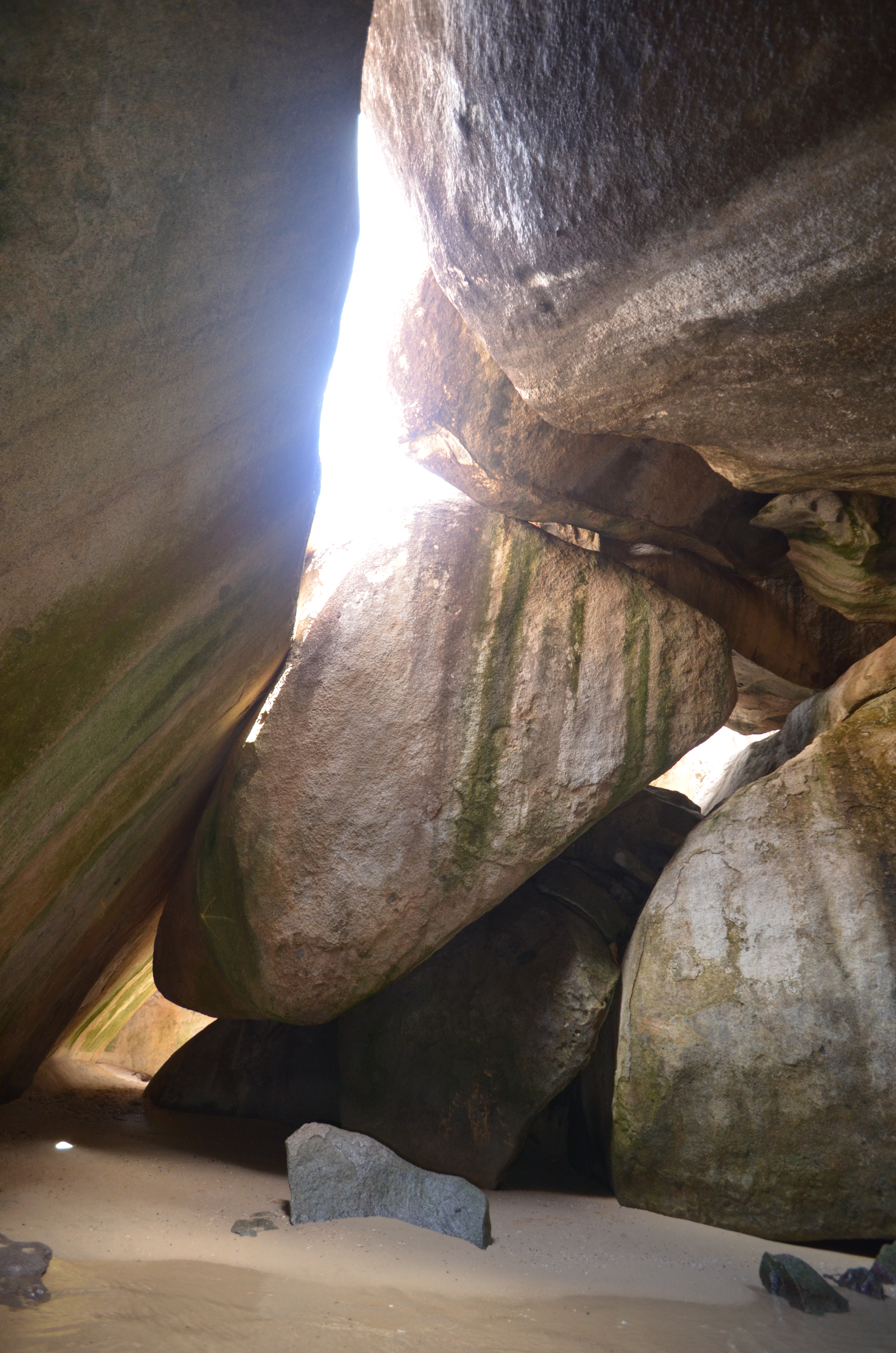 A treasure of the Virgin Islands was created millions of years ago with heat and pressure when magma pushed its way up through the Earth’s crust and just didn’t make it all the way to the surface. Instead, the molten rock cooled, creating massive granite blocks. A millenia of erosion shifted away the softer rocks and allowed the wind and sea to weather the boulders to create the massive rounded shapes we see piled along the northern coast of Virgin Gorda today. The unique geological formations make this area, known as The Baths, one of the most visited spots in all of the British Virgin Islands.