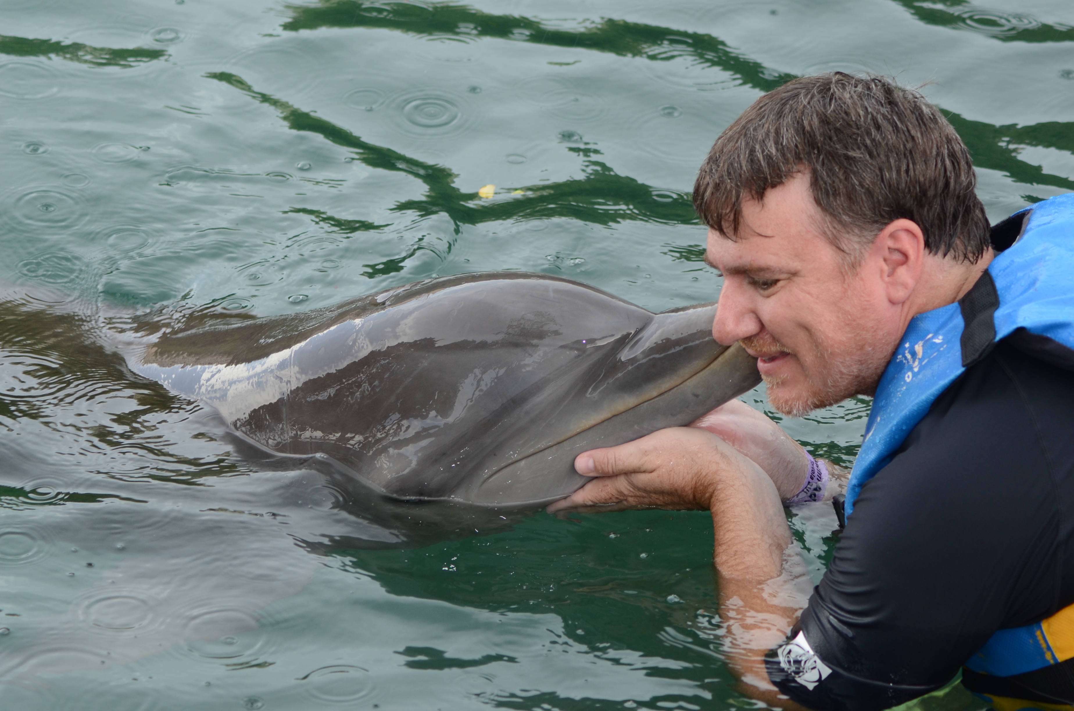 In turn, each person in the group got to touch, kiss and play with these playful, intelligent creatures. After we were well acquainted, we each got to experience the foot push. I swam out into the middle of the lagoon and floated on my stomach. The dolphins swam up behind me and each put a nose on one of my feet, pushing me through (and up out of) the water with incredible power and speed.