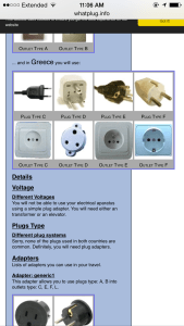 Pictures of what the heck a continental plug is, or any other kind of strange plugging device. It even tells you what kind of adapter you’d need. This person should get a Nobel Prize for his or her contribution to the traveling community. When you tell the site you’re traveling to Greece you get this: