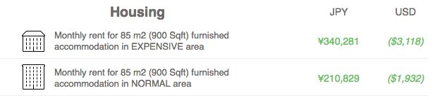 You can also do a cost comparison by inputting the names of two cities. We decided to try two big cities, Tokyo and New York City, and the result was rather shocking. The data points are clear: Tokyo (left) is cheaper than NYC, 17% cheaper. The common thought for most of us has always been Tokyo is super expensive to live in, and yet it’s cheaper than a place a few hours drive from our current abode.