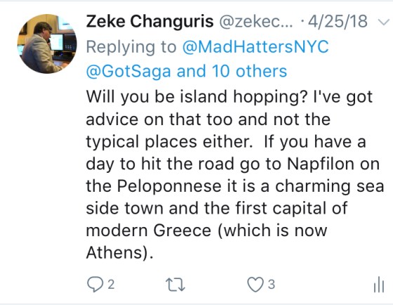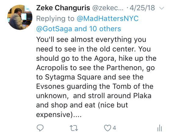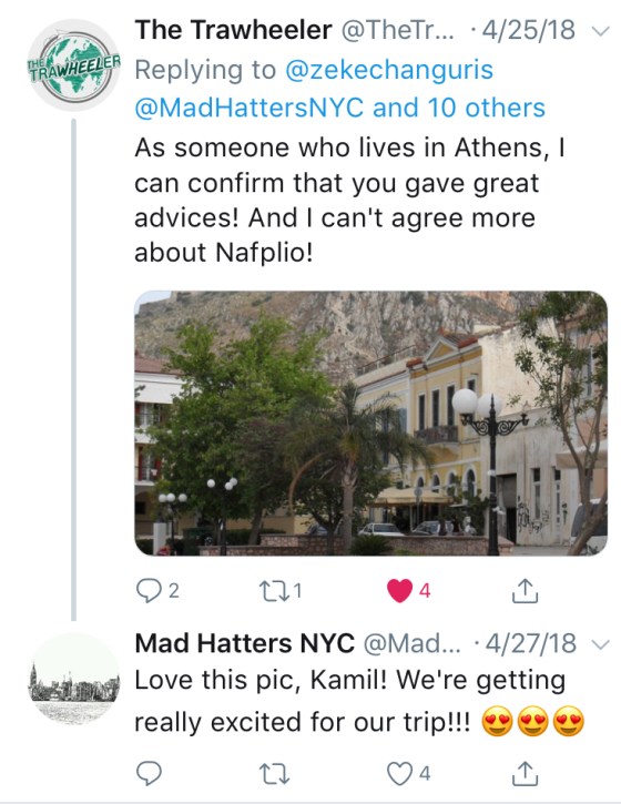 I spend a lot of time on Twitter. One particular tweet the other day caught my eye. It read: “What would you recommend in #Athens? It can be a memorable dish or a place to have coffee. We’d love to know, #TravelTribe #TravelTuesday ”