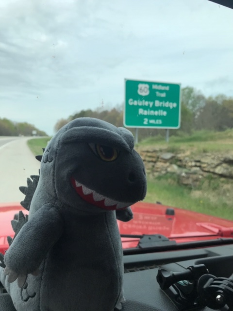 My co-pilot, Godzilla, posing in front of the Gauley Bridge in West Virginia.